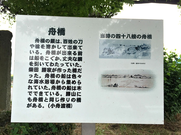 一つは、福井県の九頭竜川に架けられていた越前舟橋で、もう一つは、岩手県盛岡市の北上川に架けられていた南部舟橋(新山舟橋)です。