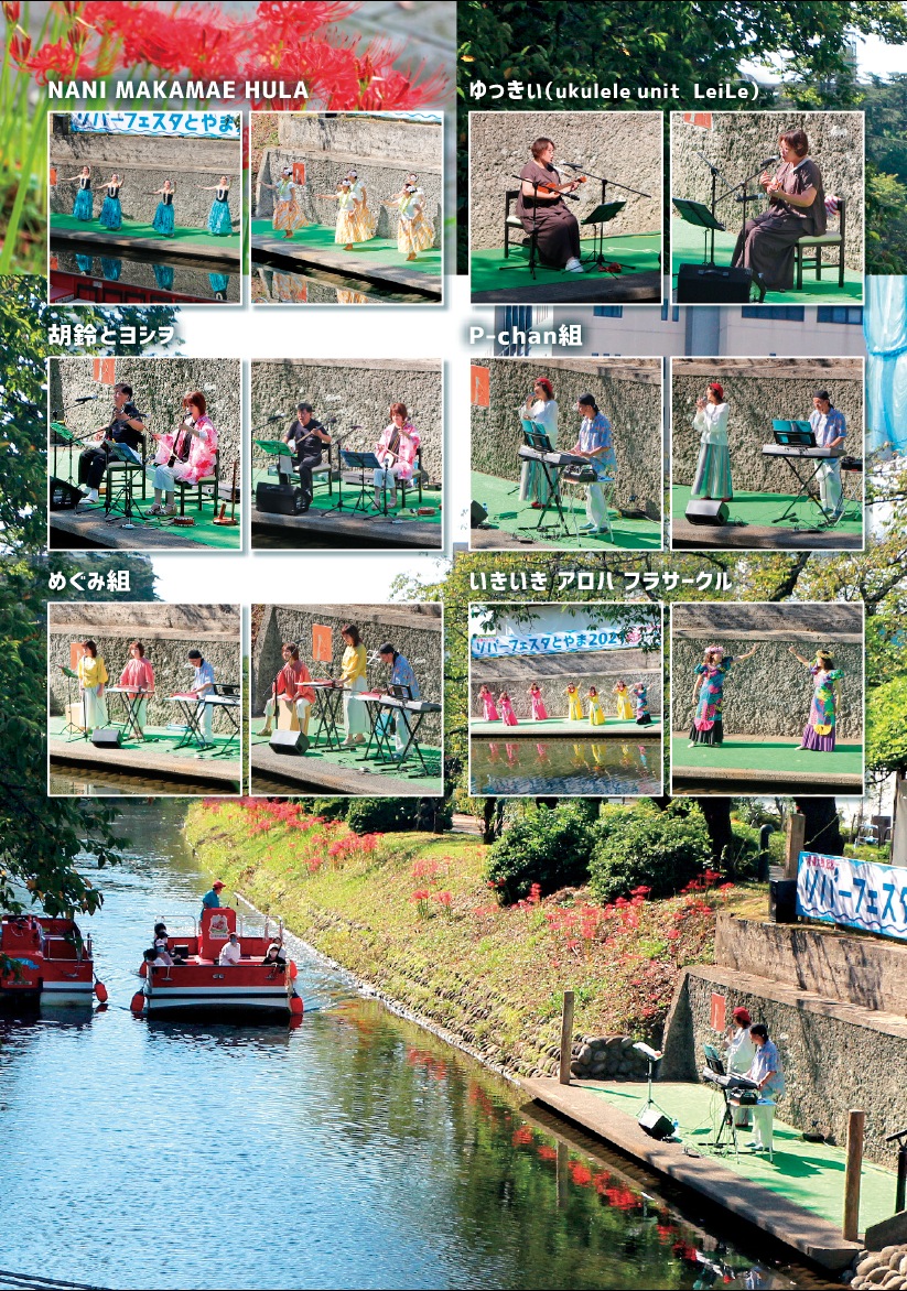 続いて、ゆっきぃ(ukulele unit LeiLe)さん。やさしく軽やかなウクレレと歌声に、気持ちが和らぎました。胡鈴とヨシヲのお二人は、胡弓のほか鍵盤リコーダーや様々な楽器が登場し、多彩な楽曲を披露。今年も澄んだ歌声と優しいハーモニーを響かせてくれたのは、P–chan組のお二人。めぐみ組の皆さんはヴィオリラをメインに、カホンやピアニカ、伸びやかな歌を交えて。そして、鮮やかな衣装に笑顔が印象的なフラダンスで、いきいきアロハフラサークルの皆さんが今年のラストを飾りました。