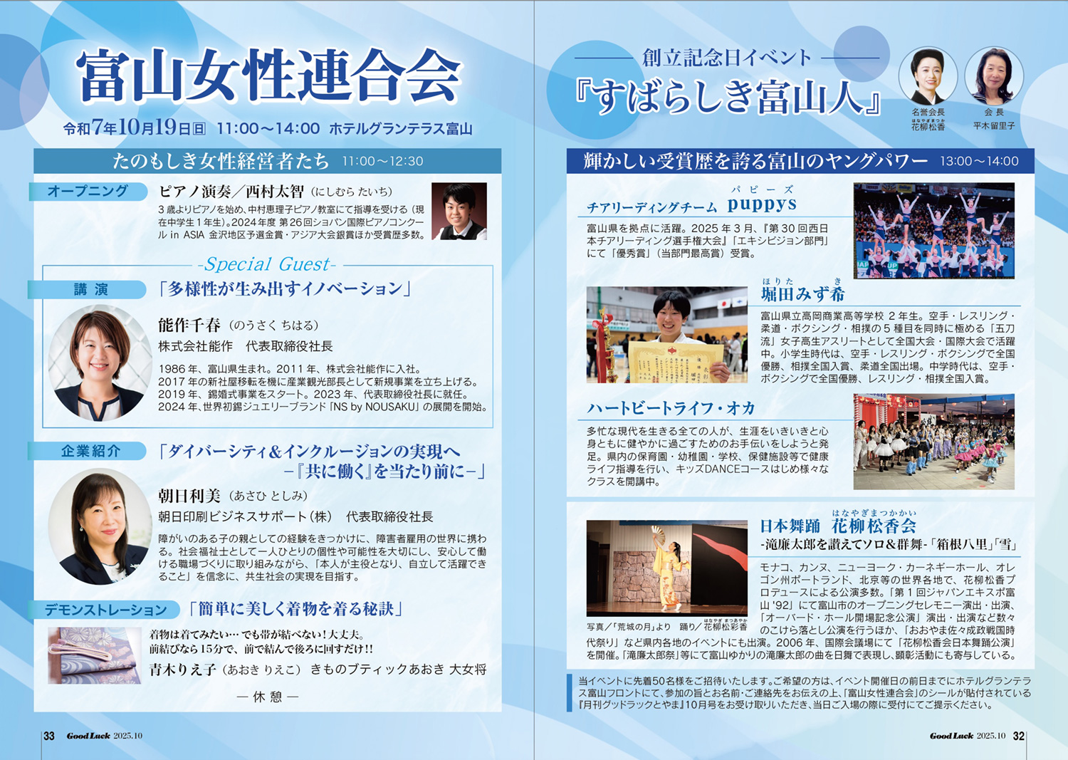 富山女性連合会 −創立記念日イベント−『すばらしき富山人』令和7年10月19日㈰ 11:00〜14:00 ホテルグランテラス富山