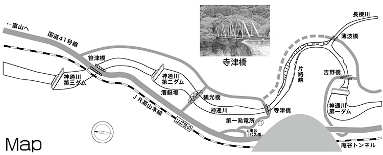 いろいろ調べてみますと、国道41号線を南下し、細入村の庵谷バス停前(あるいは、その手前にある「片路峡」の看板のところ)で左折し、神通川第一発電所の近くの赤い寺津橋の上から上流方向を眺めると、左ページ上のような美しい光景が見られることがわかりました。