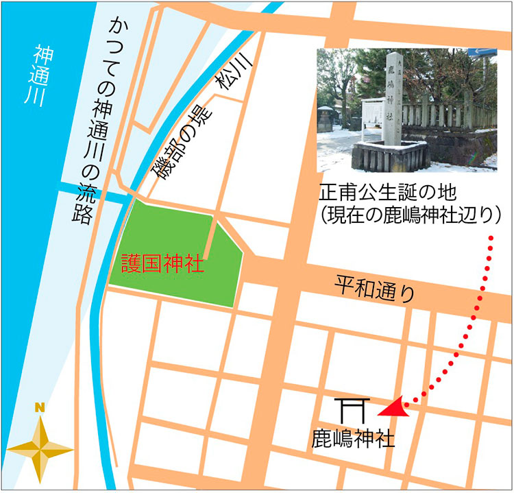 現在の護国神社を中心とする一帯には、2代藩主・前田正甫公が元禄15年に築造させた「磯部御庭」があったそうです。富山市郷土博物館発行の『博物館だより』第二十二号によると、正甫公は、磯部村(当時)にあった家老近藤善右衛門の下屋敷(現在の鹿嶋神社の辺り)で生まれ、磯部村の鎮守である鹿嶋神社を深く崇敬していたことから、磯部村から諏訪川原にかけての一帯を御用屋敷(富山藩の用地)として鹿嶋神社の社殿を新築、これを中心に一大庭園を設けたそうです。