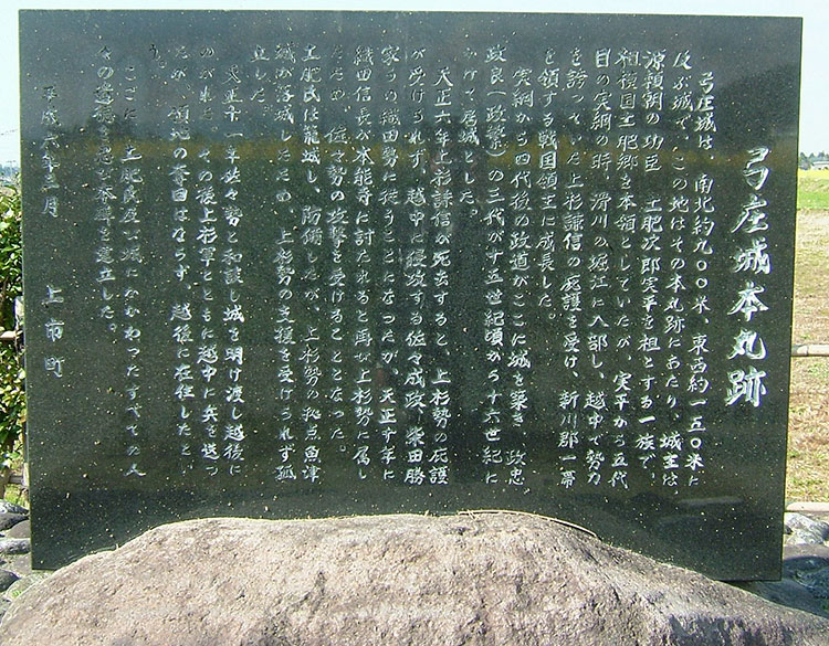 弓庄城は、南北約900メートル、東西約150メートルに及んだ城。城主は、源頼朝の功臣・土肥次郎実平を祖とする一族で、相模国(現在の神奈川県の大部分)土肥郷を本領としていたが、実平から5代目の実綱の時、滑川の堀江に入部し、越中で勢力を誇っていた上杉謙信の庇護のもと、新川郡一帯を領する戦国領主に成長。実綱から4代後の政道がここに城を築き、政忠、政良(繁)の3代が15世紀頃から16世紀にかけて居城とした。