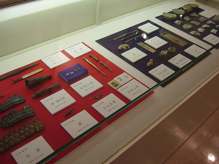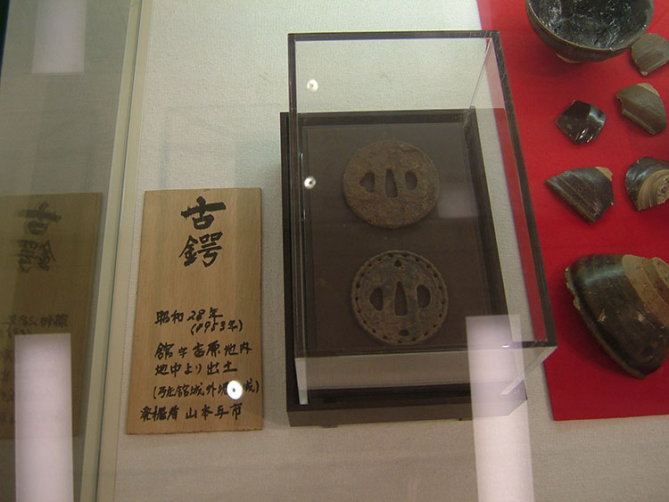 ▲城跡から掘り出された古鍔、槍、鉄砲の弾、茶碗等