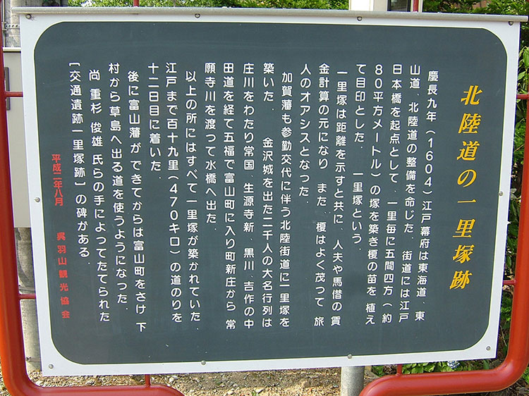 一里塚は、一里(約3.9km)ごとに路傍の両側に築かれた円丘状の土盛りで、高さは約2間(1間は約1.8m)、直径は約5間あり、その中央に樹木が植えられて街道の道しるべとした。五街道では江戸日本橋を起点としたが、加賀藩では、越中・越後の国境「境村一里塚」を基点として設置されたことが、正保4年(1647)の『越中道記』などによって推察されるという。