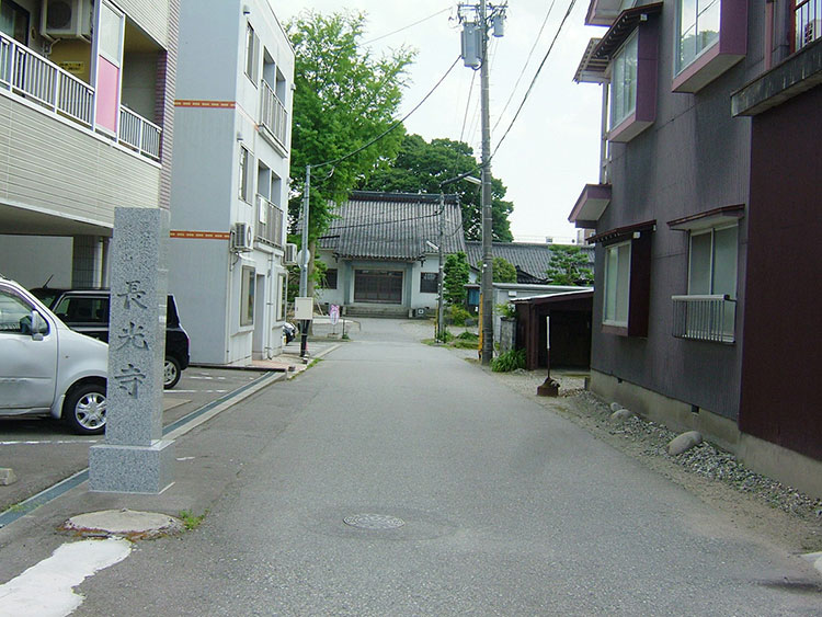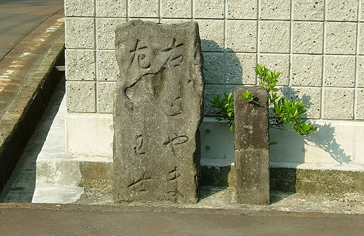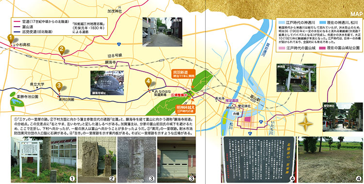 ▲下村方面に向かう藩主参勤交代の通路「往還」と、願海寺を経て富山に向かう通称「願海寺街道」の分岐点。この交差点に「右とやま、左いわせ」と記した道しるべがある。加賀藩主は、分家の富山前田氏の城下を避けるため、ここで左折し、下村へ向かったが、一般の旅人は富山へ向かうことが多かったようだ。