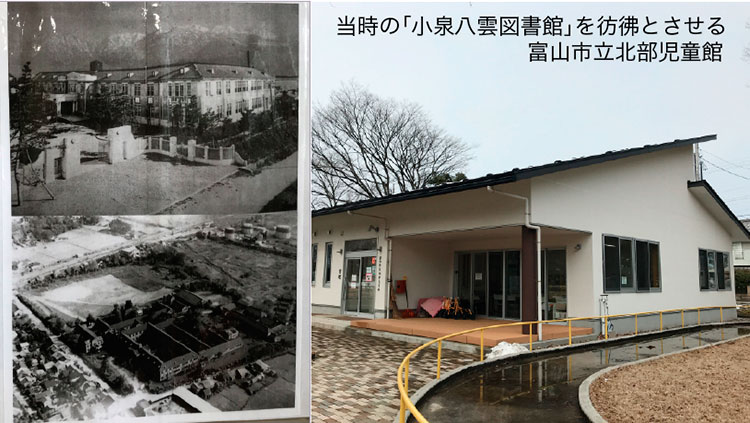 なお、旧制富山高校構内には、怪談「耳なし芳一」や「雪女」などの作品で知られる小泉八雲(ラフカディオ・ハーン)の愛蔵書等が保管された「小泉八雲図書館(『ヘルン文庫』と呼ばれた)」があった※。これは、八雲の教え子であった田部隆次が、八雲の死後、親族が愛蔵書を寄付したいという話があることを実兄の南日に話し、南日は「これを譲り受けることで日本における文化の中心にし、又、全国からいい先生に来てもらえる」と馬場はるに相談。はるはその熱意に応え、購入費を追加で寄付したことによる。平成29年3月に「富山市立北部児童館」が建設されたが、当時の小泉八雲図書館の特徴であった白色塗壁と黒の切妻屋根を参考にした外観となった。