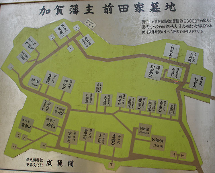 県内で藩主のお墓と言えば、高岡市の前田利長公墓所や、歴代富山藩主が眠る富山市長岡の長岡御廟が有名ですが、前田利家公をはじめとする前田一族のお墓は、金沢市野田町の野田山墓地の一角(頂上)にあります。1587(天正15)年に、利家が兄の利久を葬ったのが始まりで、広さは、約6万6000平方メートル。代々の藩主や夫人・子女のお墓が70数基作られています。