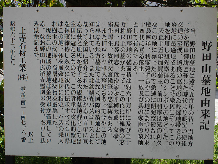 野田山墓地全体では、30万柱以上のお墓があり、その中には、大久保利通を暗殺した島田一良ら同志、文豪・室生犀星、仏教学者・鈴木大拙のお墓もあります。また、五木寛之の「朱鷺の墓」に描かれたロシア軍兵士のお墓もあり、国際的墓地として知られています。