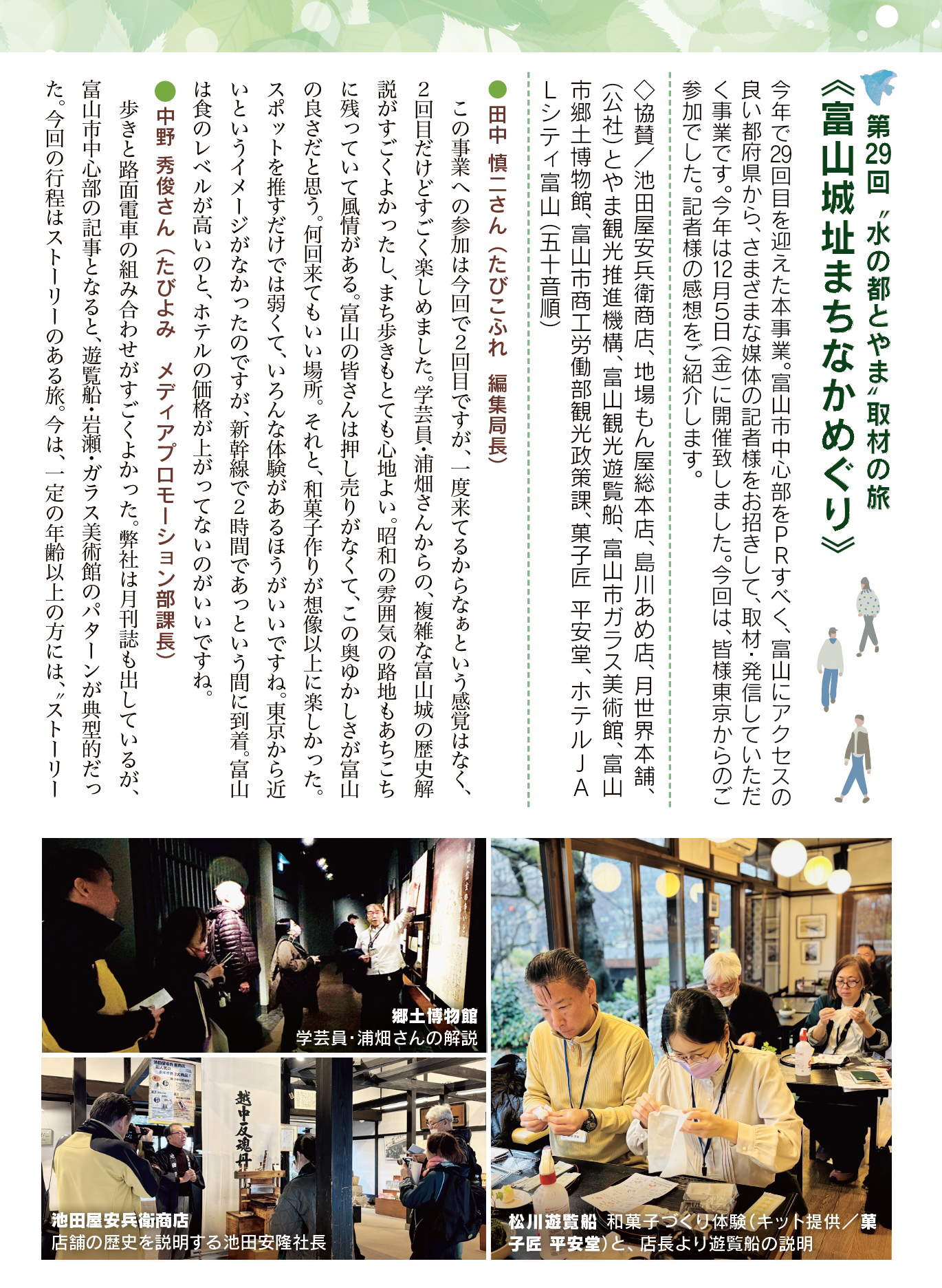 今年で29回目を迎えた本事業。富山市中心部をPRすべく、富山にアクセスの良い都府県から、さまざまな媒体の記者様をお招きして、取材・発信していただく事業です。今年は12月5日(金)に開催致しました。今回は、皆様東京からのご参加でした。記者様の感想をご紹介します。