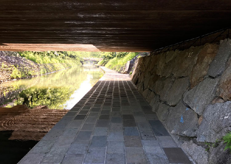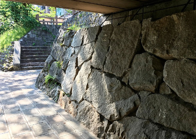 松川に架かる舟橋の橋台は、石垣になっています。昭和62年に舟橋が改修された際、橋台部から大量の石垣石材が見つかり、調査の結果、この場所には明治15年に「船橋」から架け替えられた木橋「神通橋」があったことから、その橋台石材であろうと推測されました。そして、明治16年頃に富山城二の丸にあった二階櫓門が撤去されていることから、その頃に二の丸が完全に解体されたとみられ、その石垣が新しく作られる「神通橋」の橋台に転用されたと考えられています。この場所にそんな案内板があってもいいですね。