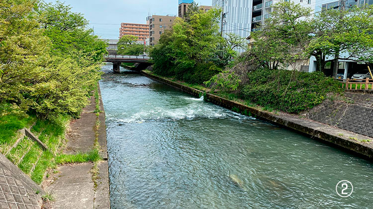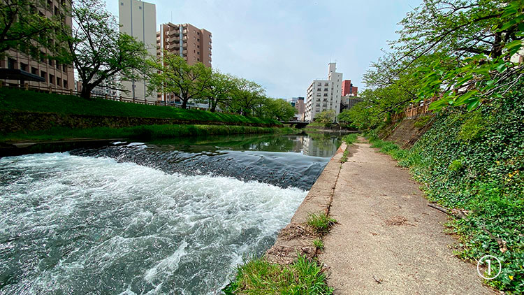 かつて神通川が蛇行していた頃、富山城そば(木町の浜)と東岩瀬湊(今の富山港)の間を帆掛け船などが数多く往来していた。その舟運を復活させたらいいのではないか、というアイデアは多くの人々によって語られてきたが、まだ実現していない。その理由はさまざまあるが、いたち川に2カ所の段差があることが大きい。1つ目は、松川の水位を安定させるための固定堰①、2つめは、与茂太郎川の少し上流にある段差②である。県美術館横のラバーダムを起伏した際の水位は、赤江川との合流点までは同じだが、そこから上流、松川との合流点までの区間の河床に勾配があるようだ。