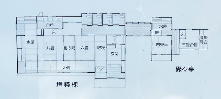 茶室には、武者小路千家11代の一指斎による「臥雲居」の扁額が掲げられていたが、「一指斎没後に、実兄である表千家11代の碌々斎が茶室全体を完成させた」とも伝えられていることから、富山に移築後は「碌々亭」と呼ばれてきた。一方、増築棟は茶湯各団体の有志が広く篤志を募り、平成28年、富山市に寄附されたものである。
