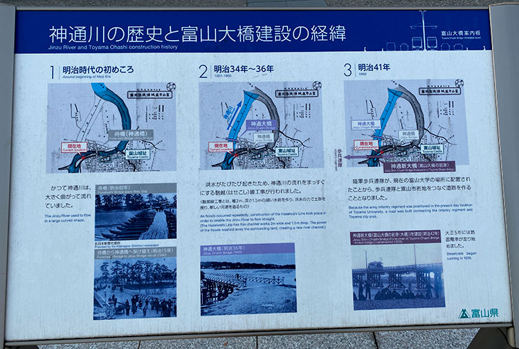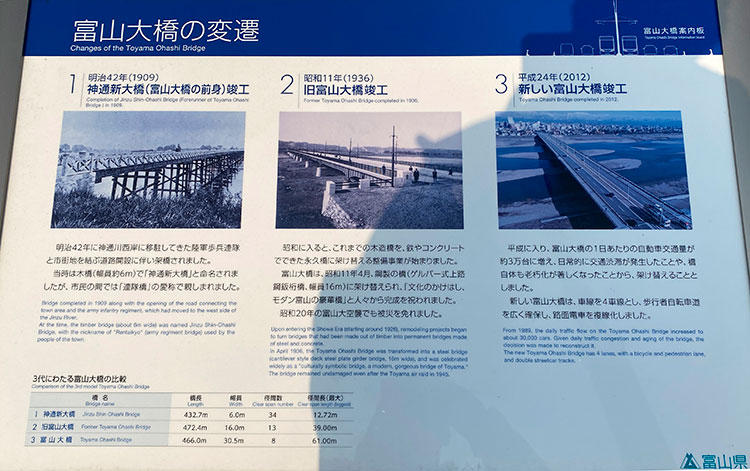 今回は、日々多くの人々が利用している富山大橋の歴史について、橋のたもとにある案内板をもとに見ていきたい。