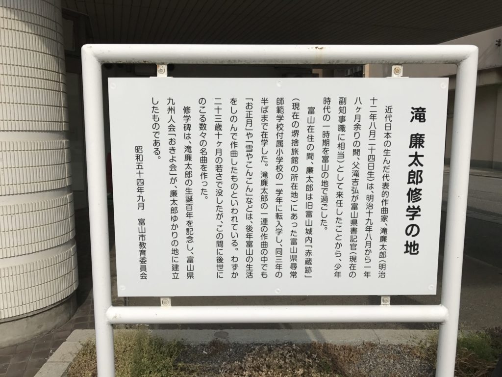 また、横の案内板には、〝滝廉太郎の一連の作品の中でも「お正月」や「雪やこんこん」などは、後年富山の生活をしのんで作曲したものといわれている。〟と紹介されています。