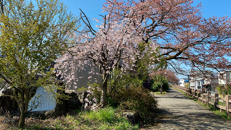 「磯部の堤」と呼ばれる松川の堤防は、古くは神通川の堤防で、各所に昔の面影を残しています。