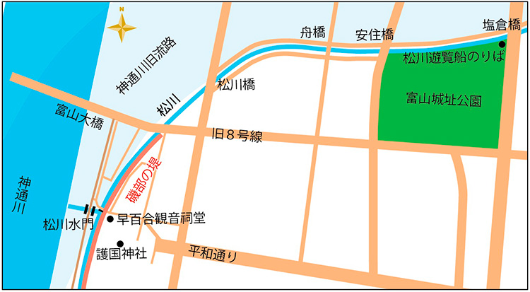 磯部の堤の近くには、護国神社、早百合観音祠堂(富山城主・佐々成政に惨殺されたという早百合伝説にちなむ一本榎のそばに住んだ作家で、ジャーナリストの翁久允の手により昭和29年に建立)、松川水門(松川の洪水を防止)などがあり、富山の歴史や文化が感じられるスポットです。
