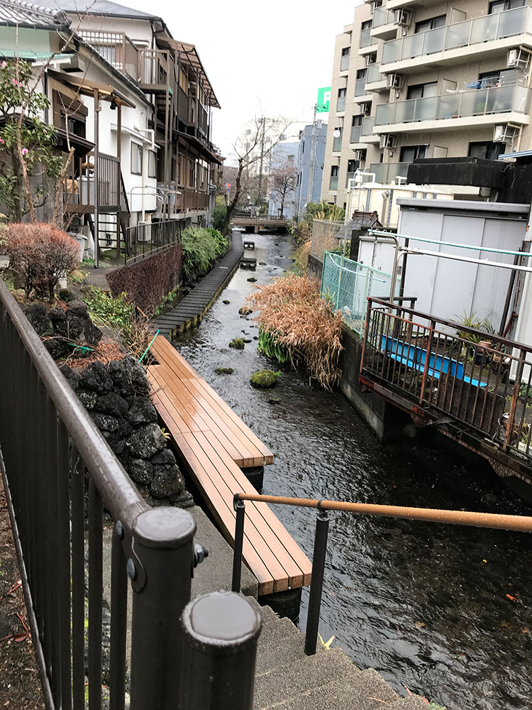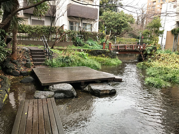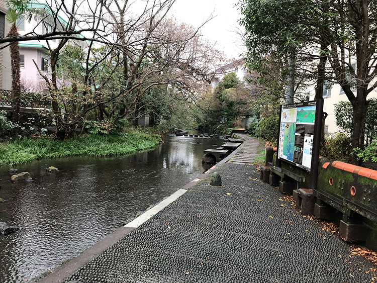 源兵衛川は、静岡県の三島駅から徒歩5分の所にある美しい農業用水路です。もともとは、約1万年前の富士山噴火の際に流出した溶岩の上にできた自然公園「楽寿園」の小浜池の湧水を水源としましたが、渇水した状況が1年のうちの大半を占めるようになったため、川の汚染がひどくなり、一時は暗渠化することも検討されました。その後、農林水産省の「農業水利施設高度利用事業」の一環で整備され、企業から冷却水の供給も受けられるようになり、昔のような美しい水辺環境を取り戻しました。今ではゲンジボタルの舞も見られるそうです。ずっと続く飛び石が美しいですね。