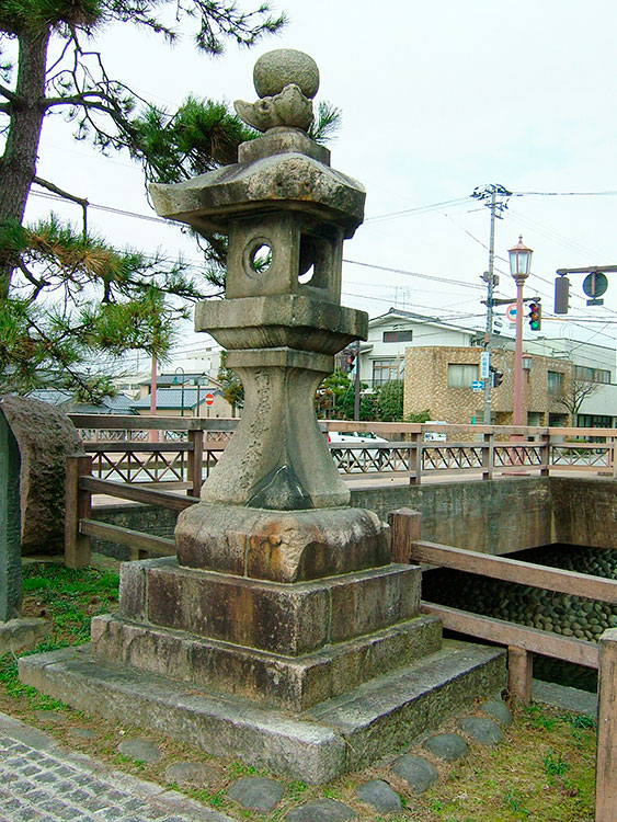 ▲松川に架かる舟橋の南詰にある常夜燈。上の部分が欠けているのは、空襲で焼夷弾があたったため。