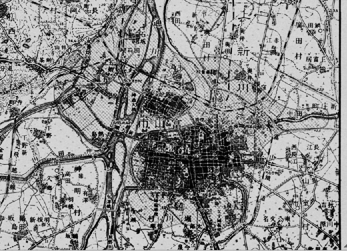 昭和20(1945)年12月、戦災の概況を復員帰還者に知らせるために、第一復員省資料課によって、全国主要都市戦災概況図が作成された。網目の部分が爆撃を受けた富山市中心部。