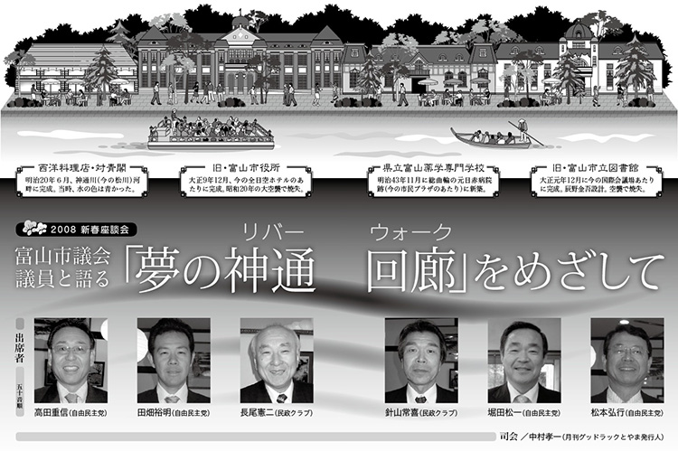 司会 私たちは〝東洋のベニス・水の都とやま〟をキャッチフレーズに、2003年、神通川直線化100周年を記念して「夢の神通回廊」プロジェクトを発表、昨年の新春企画では、松川沿いに、サンアントニオのリバーウォークのような賑わいを創出するために、明治・大正期にかけて中心部にあった建物の復元を提案しました。
