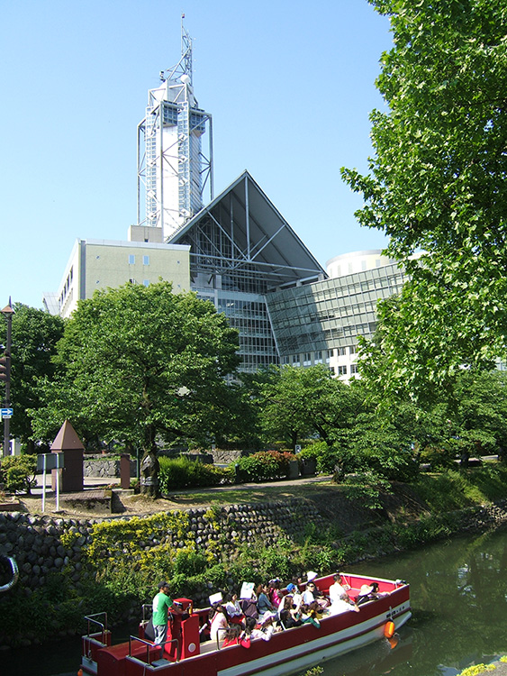 ▲富山市庁舎と松川遊覧船は、市民のシンボルとなっている。