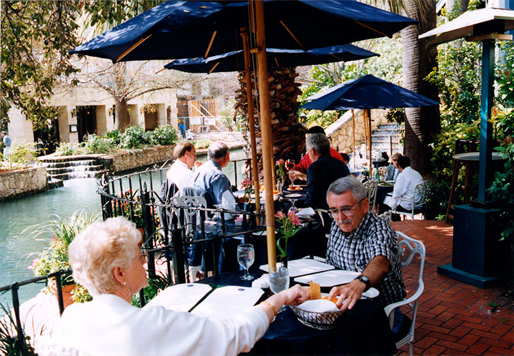▲アメリカ・サンアントニオの川沿いのカフェでくつろぐ人々。