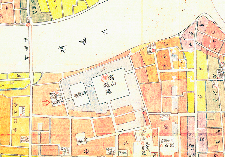 ▲滝廉太郎が通っていた小学校は、旧富山城内にある富山県尋常師範学校(矢印)に付設されていた。