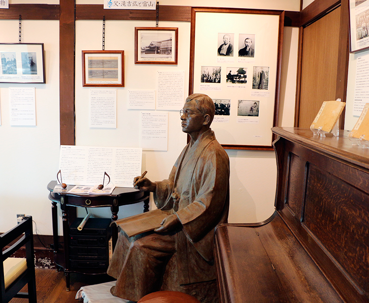 平成5(1993)年9月、滝廉太郎が学び遊んだ小学校跡に隣接して建つマンションの5階1室に「滝廉太郎記念館」をオープン(現在は松川茶屋内へ移設)。偉大な作曲家と富山の豊かな自然の関わりをテーマにし、県内外から関心を集めた。