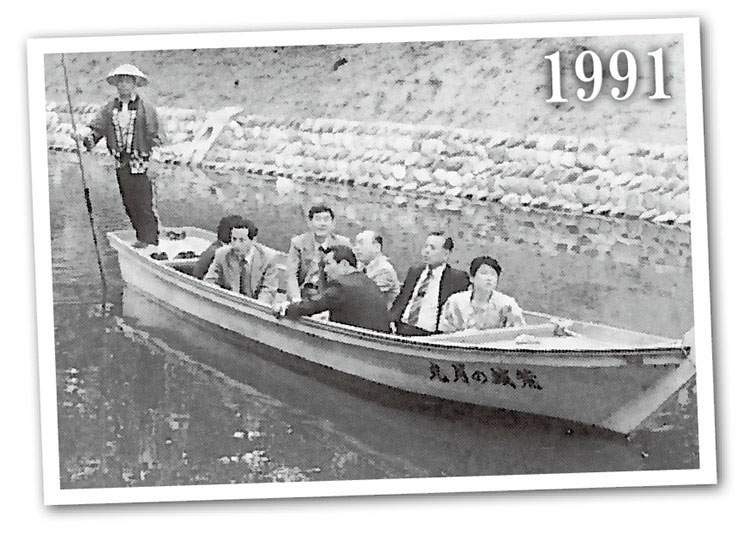 ▼当時の誌面より”水の都とやま”のシンボルをつくろうと、松川遊覧船上で熱く語り合う議員たち。