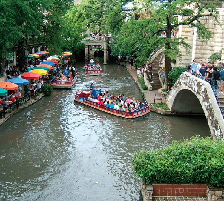 ▼立体的に水辺空間を楽しむことができるアメリカ・サンアントニオの賑わい。
