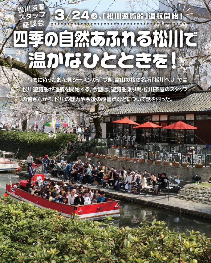 待ちに待ったお花見シーズンが近づき、富山の桜の名所「松川べり」では松川遊覧船が運航を開始する。今回は、遊覧船乗り場・松川茶屋のスタッフの皆さんから、松川の魅力や今後の改善点などについて話を伺った。