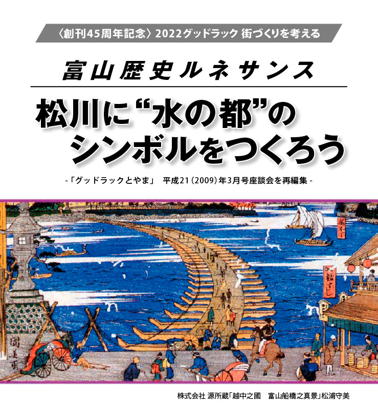 江戸時代、神通川(今の松川)には日本最大規模の「船橋」が架けられ、立山と並ぶ「越中富山の名所」と謳われていた。この歴史を今に伝える松川を、富山の歴史と水辺のシンボルとして整備していくことが、市民県民の誇りにつながるのではないだろうか。