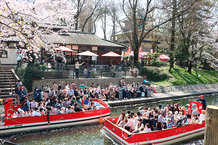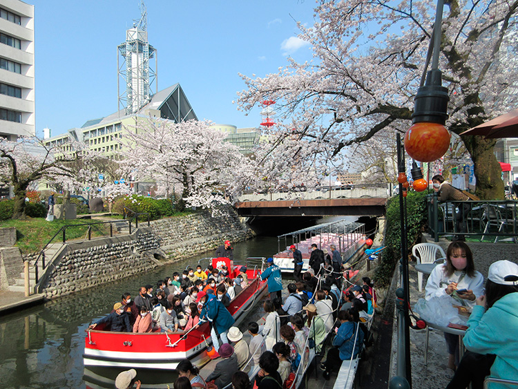 ▼花見客で賑わう松川遊覧船。船長から川の歴史の解説を聞きながら、お花見を楽しめる。