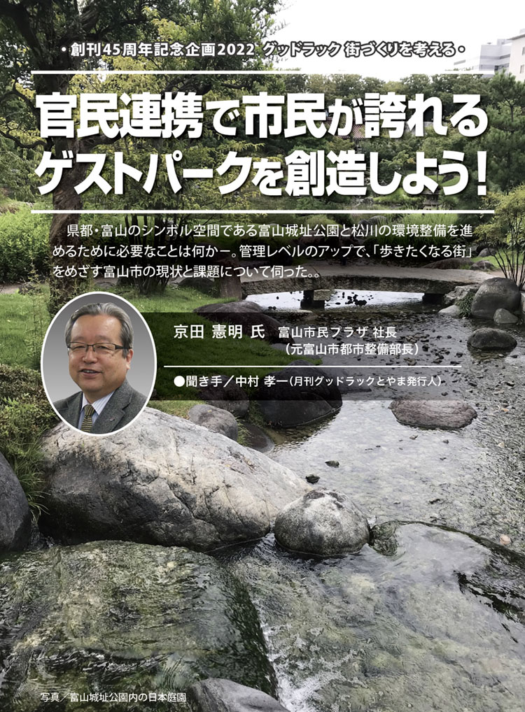 県都・富山のシンボル空間である富山城址公園と松川の環境整備を進めるために必要なことは何か-。管理レベルのアップで、「歩きたくなる街」をめざす富山市の現状と課題について伺った。