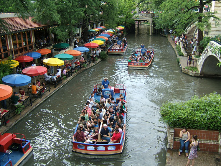 ▼全米ナンバーワンの人気都市・サンアントニオ。護岸を切り取ったリバーウォーク沿いには、レストラン、カフェテラス、ホテル、店舗が作られ、リゾート感あふれる憩いの場となっている。
