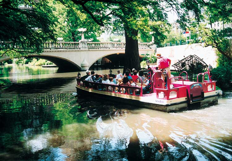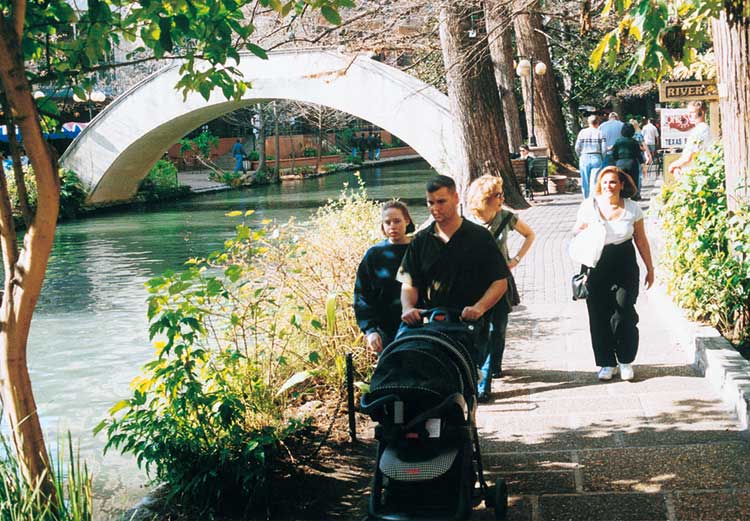 ▼アメリカ・サンアントニオのリバーウォークには、散歩を楽しめる様々な仕掛けが工夫されている。