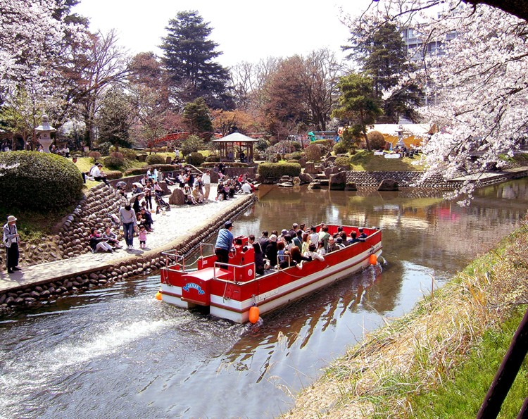 ▼松川べりでお花見を楽しむ人々と、その横をゆったり通り過ぎる松川遊覧船の光景は“夢の世界”。