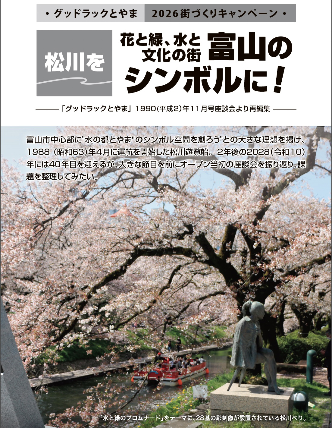 富山市中心部に”水の都とやま”のシンボル空間を創ろう”との大きな理想を掲げ、1988(昭和63)年4月に運航を開始した松川遊覧船。2年後の2028(令和10)年には40年目を迎えるが、大きな節目を前にオープン当初の座談会を振り返り、課題を整理してみたい。