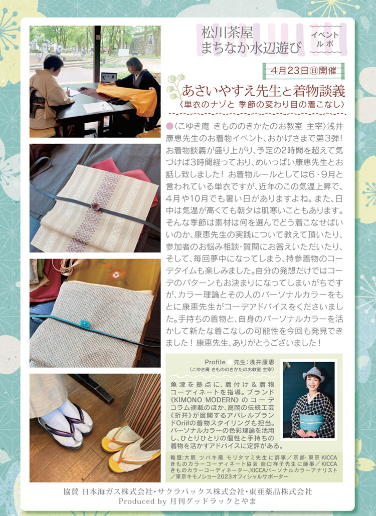 松川茶屋 まちなか水辺遊び イベントルポ 4月23日開催 あさいやすえ先生と着物談義