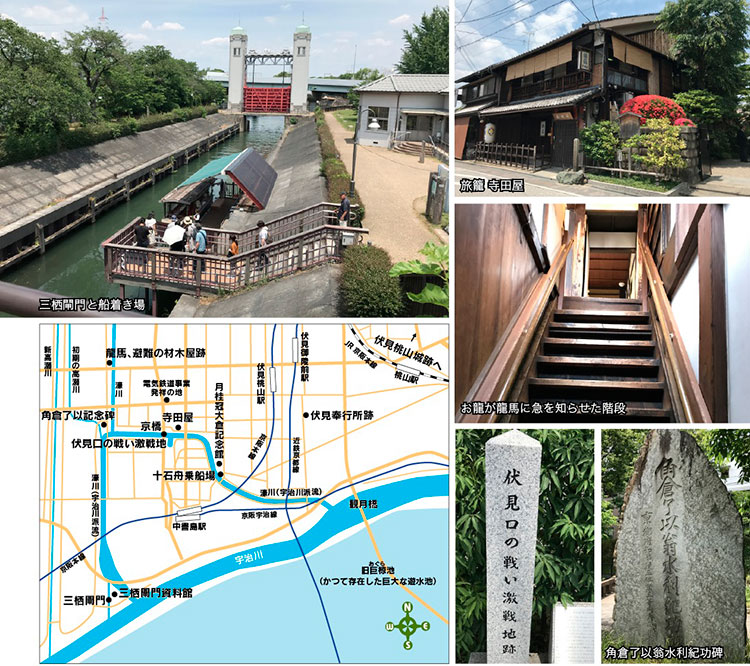 幕末、薩長同盟を締結させた直後の慶応2年(1866年)、近くの旅籠・寺田屋に宿泊していた坂本龍馬は伏見奉行所配下の捕り手に囲まれます。この時、危機を察知したお龍により命を救われた龍馬は、しばらく伏見薩摩藩邸にかくまわれていましたが、右手の傷を癒すため寺田屋浜から三十石船に乗り、お龍とともに九州の霧島へと旅立ちました。