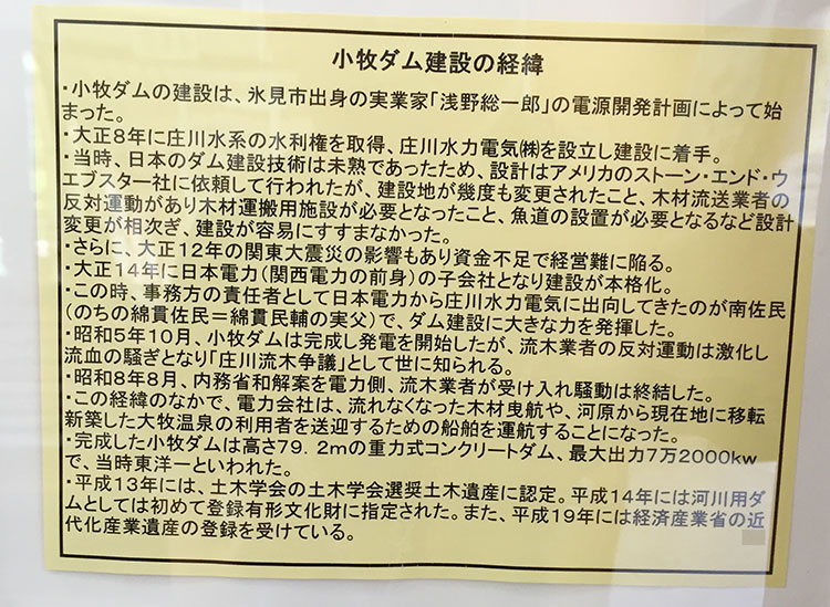 小牧ダムの建設は、氷見市出身の実業家、浅野総一郎の電源開発計画により始まった。大正8年に庄川水系の水利権を取得、庄川水力電気㈱を設立し、建設に着手。建設地が幾度も変更されたり、木材流送業者の反対運動があり、木材運搬用施設や魚道の設置が必要となるなど設計変更が相次ぎ、建設は容易に進まなかった。さらに大正12年の関東大震災の影響もあり資金不足で経営難に。大正14年に日本電力(関西電力の前身)の子会社となり建設が本格化。この時、事務方の責任者として日本電力から庄川水力電気に出向してきたのが南佐民(のちの綿貫佐民=綿貫民輔氏の実父)で、ダム建設に大きな力を発揮した。