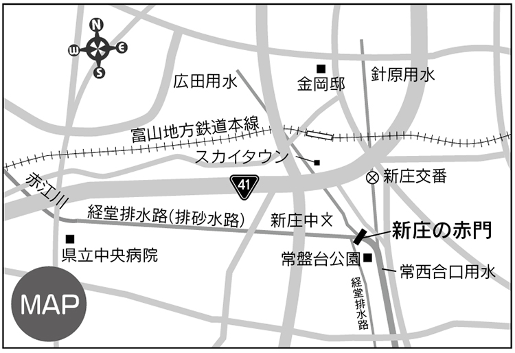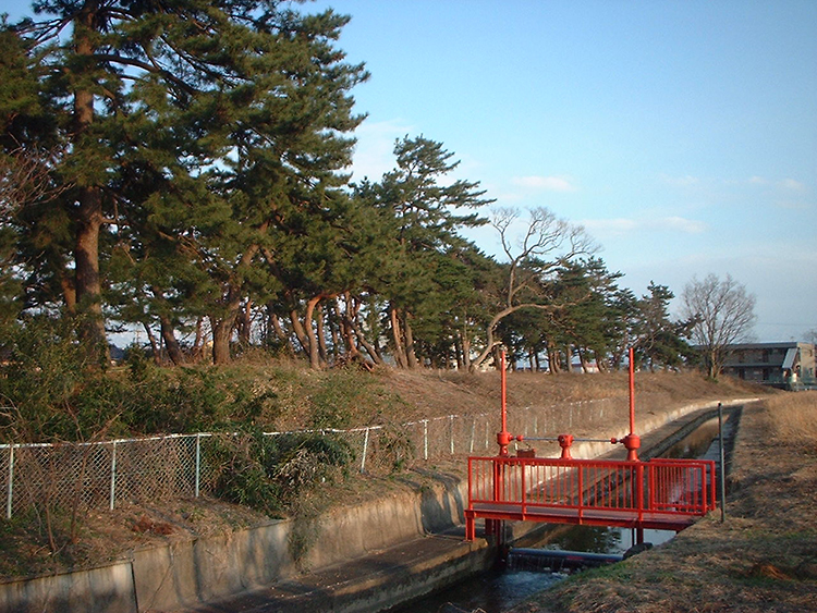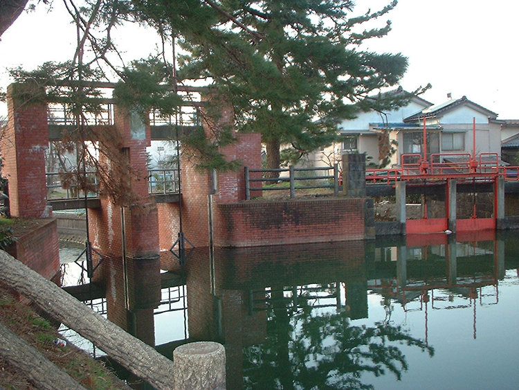 ところが、明治32年の洪水により土砂が流入し用水をふさいだ為、明治33年、排砂水路を設け、土砂を赤江川経由で、当時はまだ蛇行していた神通川へ排出する工事が行われた。その時に作られた水門が、地元の人達から「新庄の赤門」と呼ばれる水門だ。平成5年に補強工事が行われた。昔ながらの手動式分水門で、常西用水から見て右側に広田用水へのゲート、左側に排砂用のゲートが設けられている。常西用水上流に発電所ができ、沈砂池も設置された為、今ではほとんど砂は流れてこなくなったそうだが、やはり大雨の時などは砂が混じるため、排砂機能を果たしているとのこと。