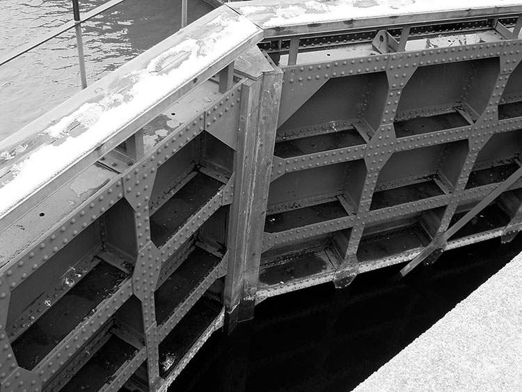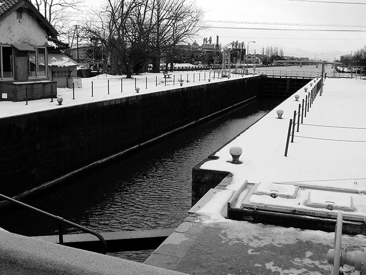 ▲国指定重要文化財 中島閘門 運河の河口から約3.1㎞上流に位置し、約2.5mの水位差を二対の扉で調節するパナマ運河式の閘門。平成10年に改修された。扉は珍しいリベット接合(約15,000本)。
