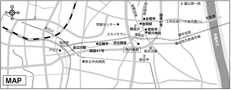 新庄城は、現在の新庄小学校にあり、東に常願寺川、西に荒川を望む要害の地にあり、北陸道に面する交通の要衝でもあったため、早くから軍事上の拠点として重要であった。永正17年(1520)、越後の長尾為景は神保慶宗らを討つために越中に侵攻し、慶宗を敗走させ自刃に追い込んだ。このとき新庄に陣を構えたことが初めての記録という。この頃、新庄城は長尾方によって整備されたとみられる。元亀3年(1572)、上杉輝虎(謙信)の武将・鯵坂長実が在城。同年5月、一向一揆勢が富山城を攻略すると、新庄城は、上杉氏の富山城攻めの前線基地となった。同年8月、謙信の約1万の軍勢が新庄に結集。一向一揆軍はわずか4000の兵力とあって、総指揮を担当する瑞泉寺の杉浦壱岐玄任は、加賀の坪坂伯耆らに頼み、江沼、能美両郡からの援軍を求めた。こうして新庄城と富山城との間で激しい攻防戦が始まった。特に、尻垂坂の合戦がすさまじかった。尻垂坂は、西新庄の正願寺前あたりから、田中町の間のびや川の堤の登り口地域にあった。両軍が激突した頃から幾日も雨が降り続き、多数の戦死者の流血によりびや川の流れが真っ赤に染まったといわれる。そして、一揆勢は破れた。謙信は戦死者を弔い、経堂を建てたので、このあたりの地名を〝経堂〟という。その後、佐々、前田の城となり、元和元年(1615)までには廃城となったとみられる。