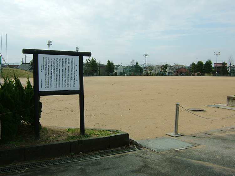 ▲新庄小学校グラウンド。新庄城の本丸があったと推定される。江戸時代の記録では、東西約140m、南北100m以上。周囲には土塁と幅約8mの堀がめぐっていた。