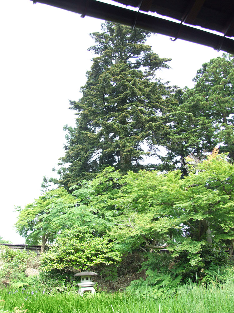 ▲庭園越しにのぞむ栂の大木。樹齢300年以上。代々浮田家の守り木である。