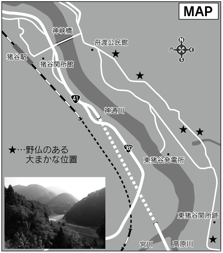 東路には野仏が多く見られ、「野仏の里」と呼ばれている。最大の石仏群(16体)が集落の南のはずれにある他、飛騨から流入したとされる変わった道祖神が猪谷発電所の貯水池手前右手の民家前に立っている。その他にも、地蔵、大日如来、馬頭観音、不動明王、猿田彦大神などの石像がある。それらを見ながら歩いていると、ゆったりした気持ちになれる。