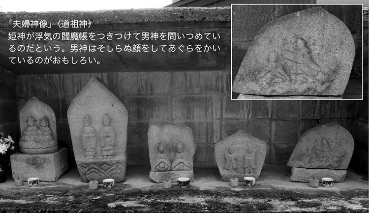 ▲男女2神が寄り添う双体道祖神。(道祖神は、村の守り神、子孫繁栄、近世では旅や交通安全の神として信仰されている)