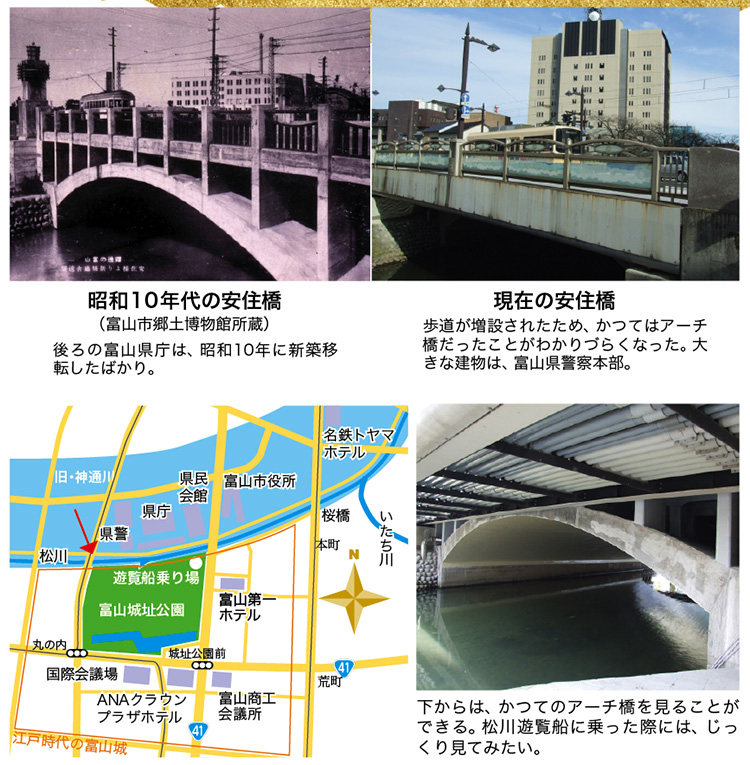 「安住橋」の名前は、富山城が安住城と呼ばれることもあったことから、その近くの橋ということで名付けられたのではないか、とされている。