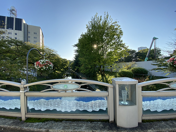 安住橋は、平成9年〜10年に改良工事が行われ、鋼桁による歩道部分が増設された。その結果、RCアーチ橋であることがわかりづらくなったが、遊覧船で下をくぐると、かつてのアーチ橋を体感できる。改良工事では、「ガラスの街とやま」らしく、全面ガラスの高欄が採用された。